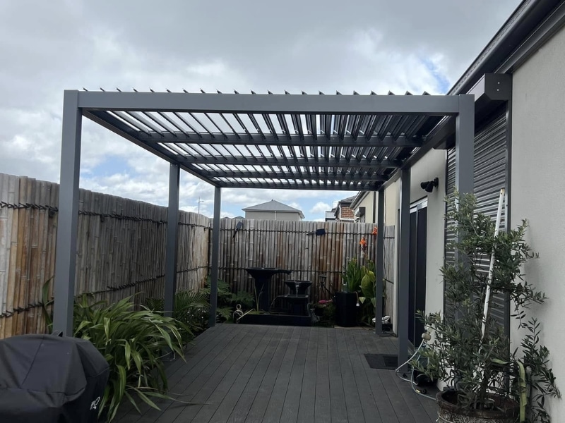 Pergola Measurements example with grey louvre pergola installed in narrow backyard beside fence.