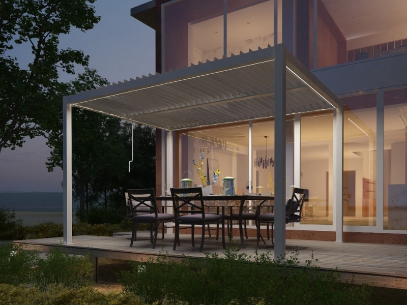 Front view of illuminated louvered pergola over patio dining table, showing options before staining pergola surfaces.