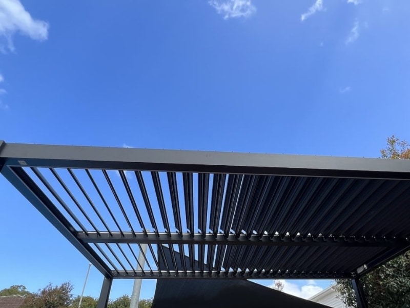 Pergola in rooftop with black louvered panels partially open against cloudy sky and surrounding trees.